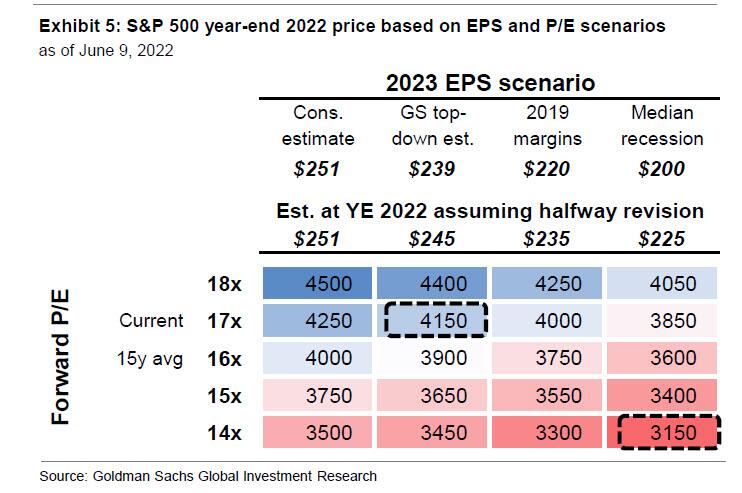 Κατά την Goldman Sachs ο βασικός χρηματιστηριακός δείκτης των 500 μεγαλύτερων εταιριών της Wall Street όπως ενσωματώνοντας τον δείκτη S&P 500 θα πέσει στα 3.150 μονάδες σε περίπτωση ύφεσης ως αποτέλεσμα της κατάρρευσης των P/E δηλαδή των κερδών των εταιριών σε σχέση με τις αποτιμήσεις.