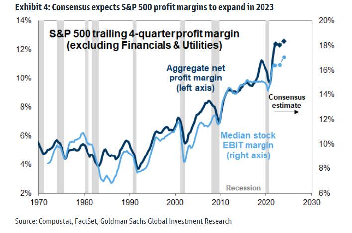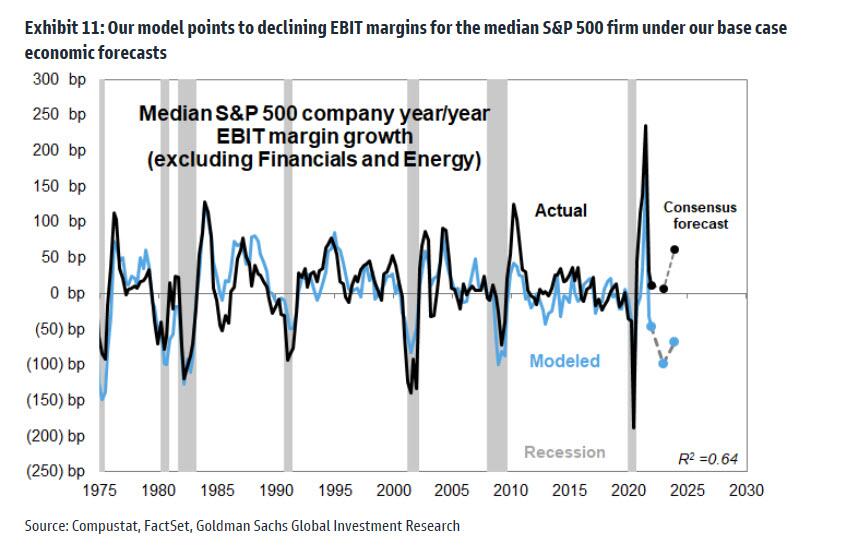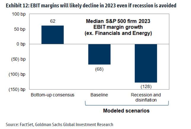 Με καθυστέρηση η Goldman αναδιπλώθηκε ως προς τις εκτιμήσεις της για τα μελλοντικά κέρδη, απηχώντας αυτό που υποστηρίζει εδώ και μήνες ο Michael Wilson της Morgan Stanley, ότι οι προβλέψεις για τα κέρδη του S&P 500 για το 2023 «μοιάζουν πολύ αισιόδοξες και θα μπορούσαν να πιέσουν περαιτέρω τις τιμές των μετοχών καθώς αναμένεται μεγάλη πτώση στην κερδοφορία των επιχειρήσεων, υποδηλώνοντας ότι τα πολλαπλάσια P/E είναι στην πραγματικότητα αναντίστοιχα με την πραγματικότητα.