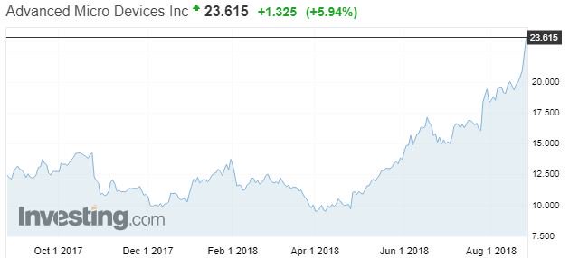 Στα υψηλότερα επίπεδα που έχουν καταγραφεί από τον Αύγουστο του 2006 διαπραγματεύεται η μετοχή της Advanced Micro Devices (AMD) στις χρηματιστηριακές αγορές της Νέα Υόρκης, με ώθηση από τα άκρως ικανοποιητικά οικονομικά αποτελέσματα του δεύτερου τριμήνου, που οδήγησαν σε αύξηση της τιμής-στόχου (μετοχής) από πλευράς αναλυτών.