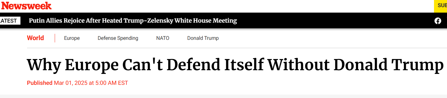 Χωρίς την υποστήριξη των ΗΠΑ, οι ευρωπαϊκές χώρες είναι ιδιαίτερα αποδυναμωμένες, σύμφωνα με το περιοδικό Newsweek σε δημοσίευμά του το Σάββατο 1 Μαρτίου 2025.