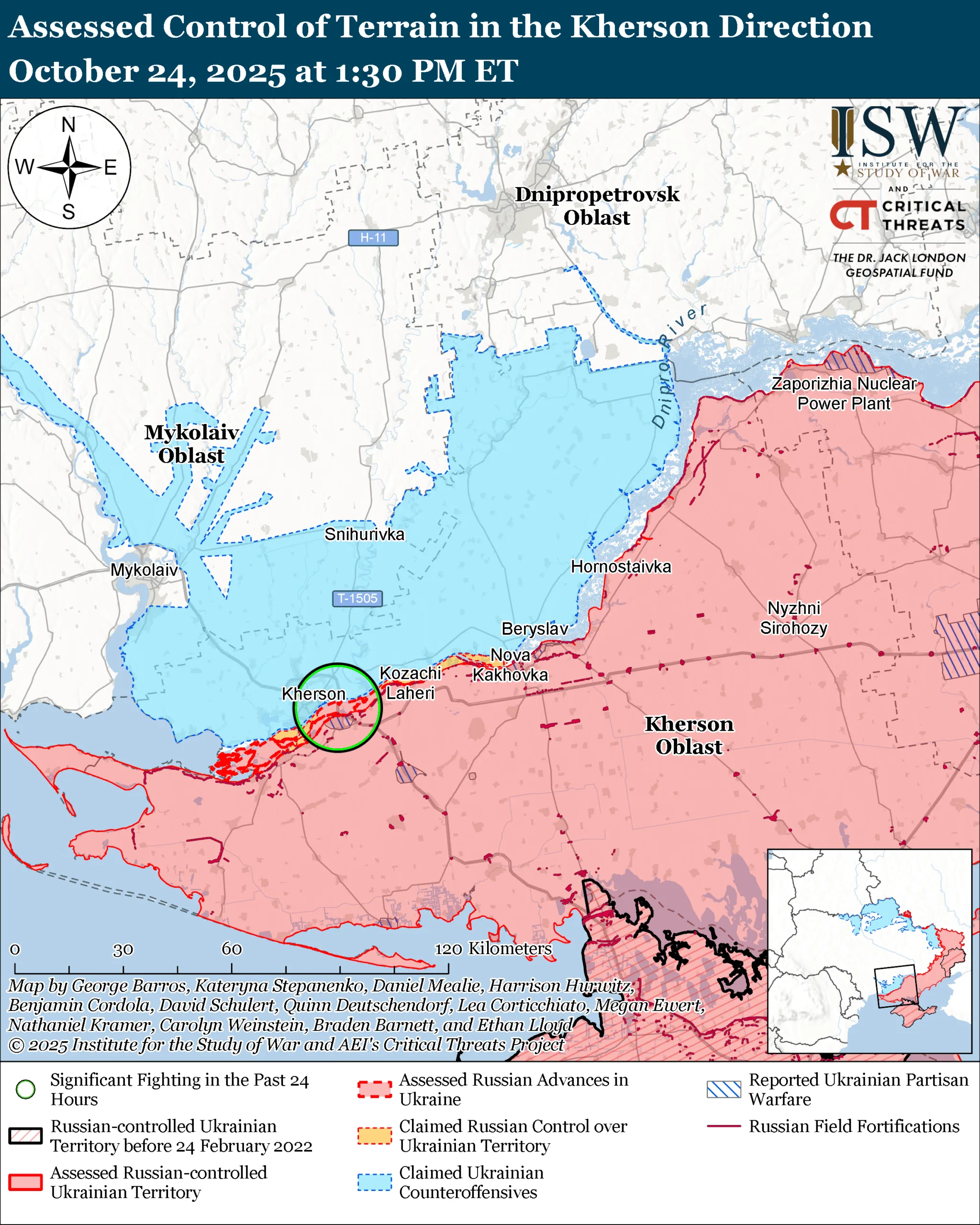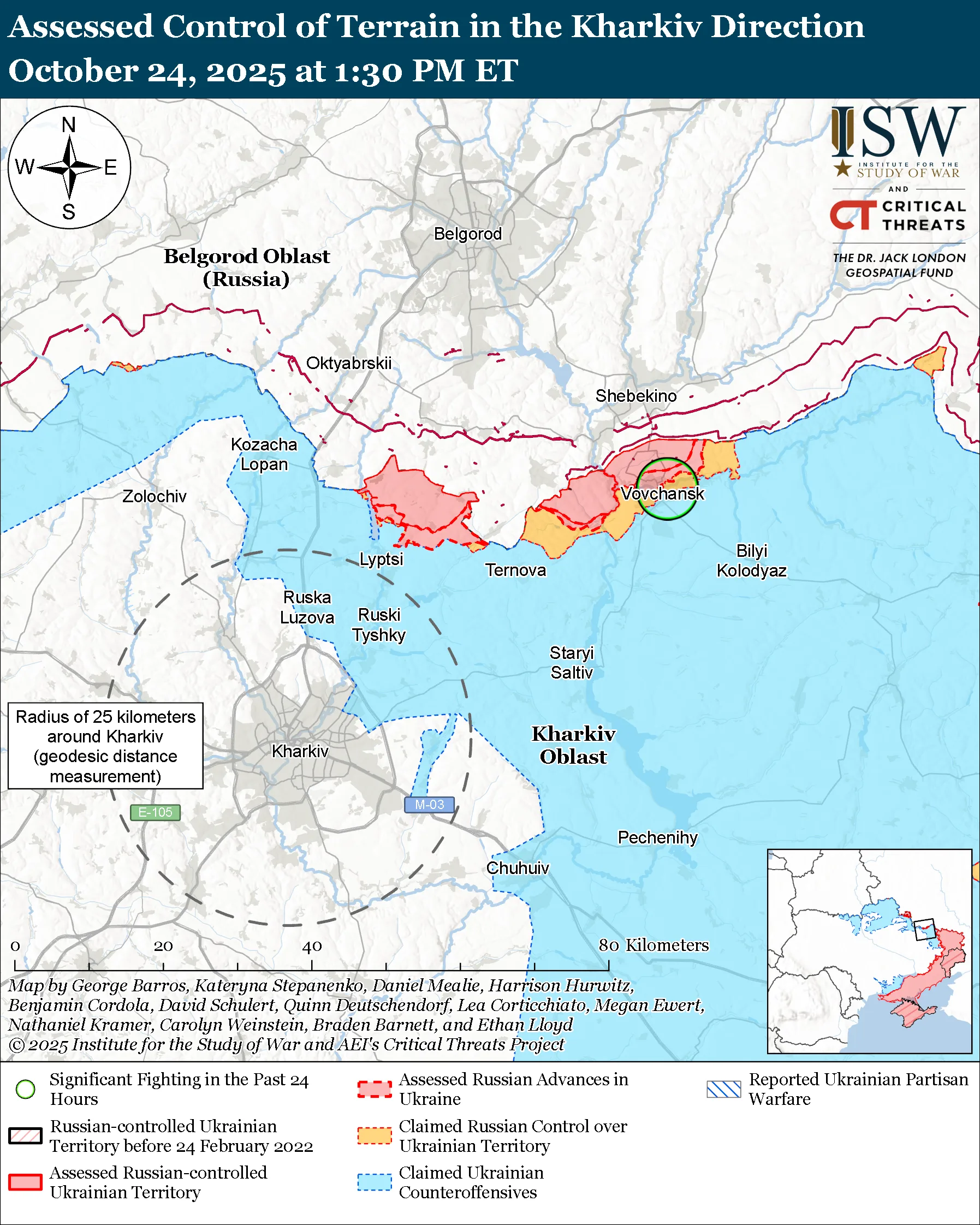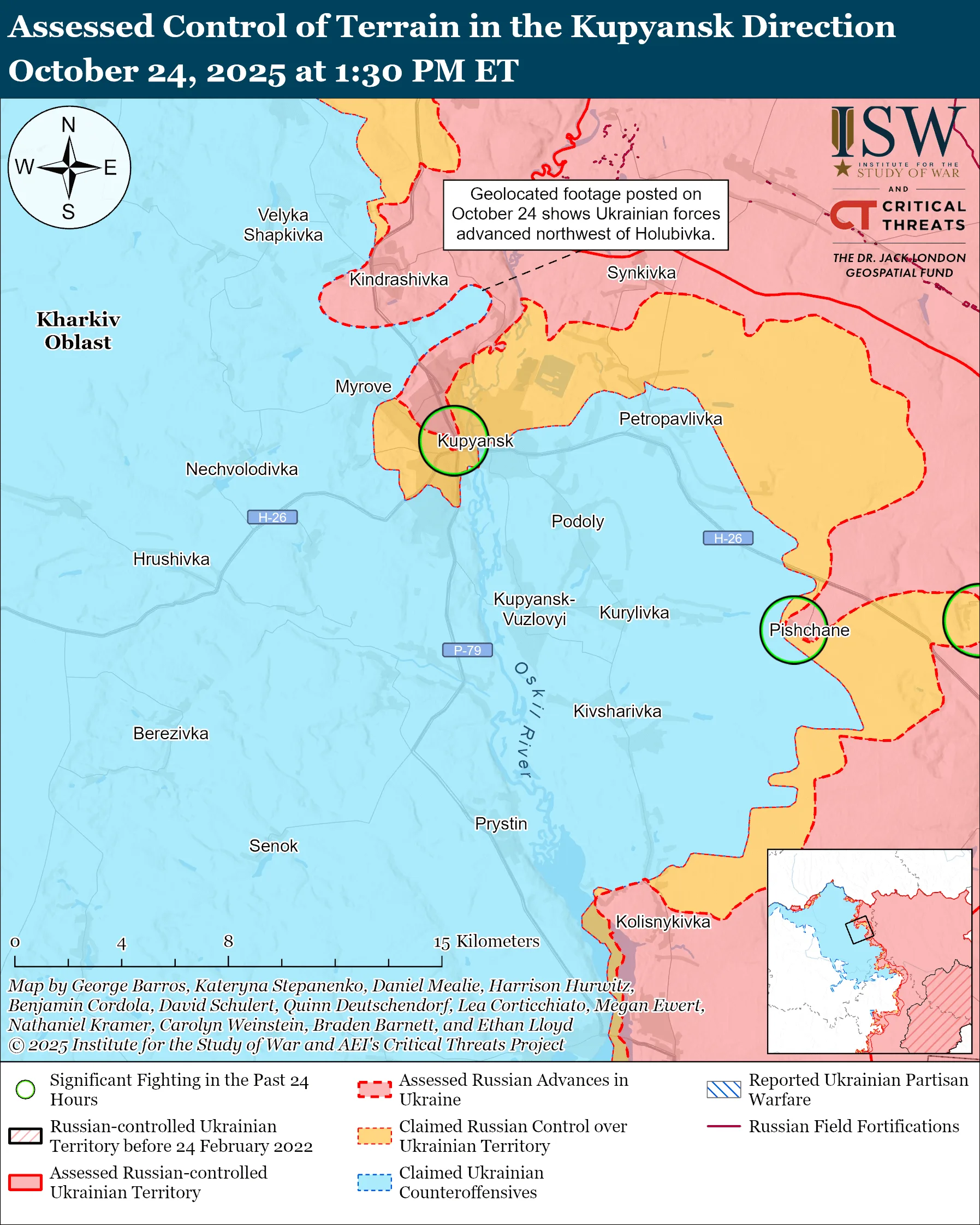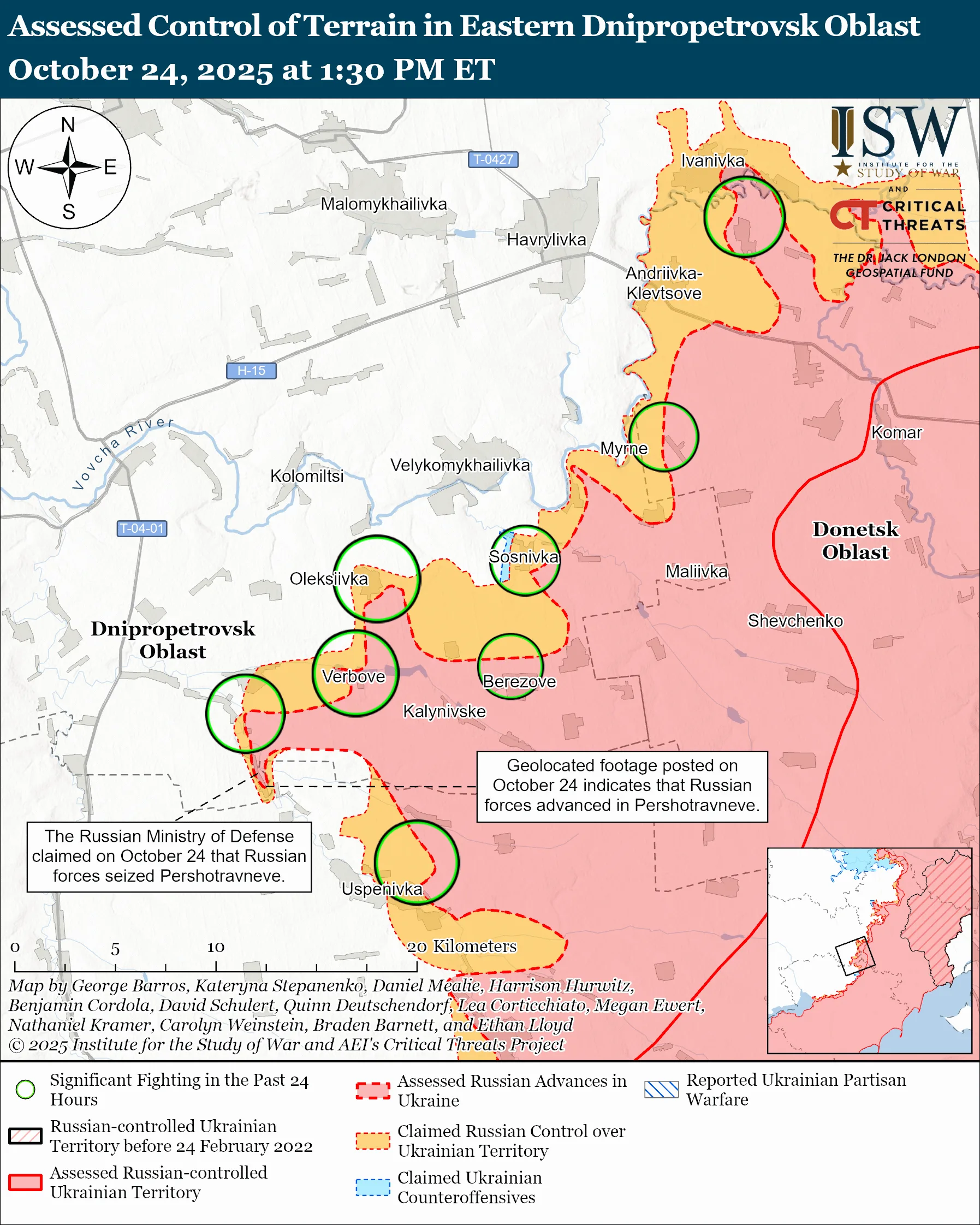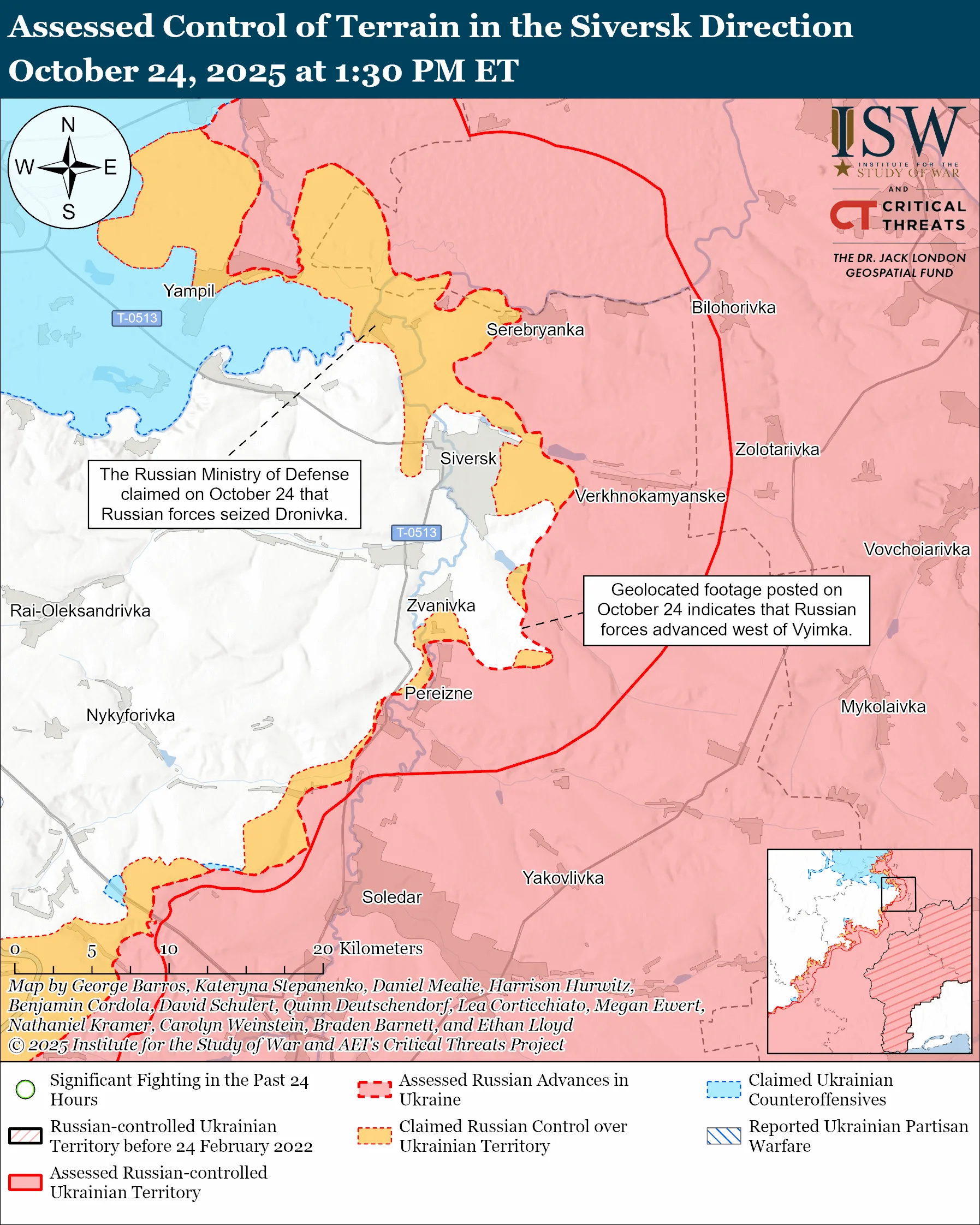 Geolocated footage published on 23 and 24 October shows Russian forces recently advancing in central and western Pokrovsk and capturing positions along the Pokrovsk railway line.
