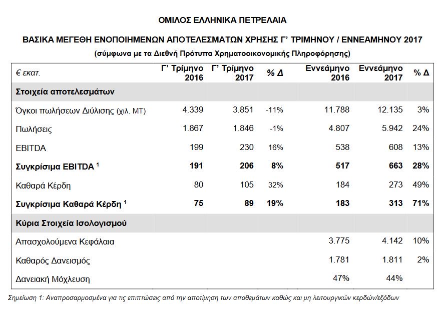 Οι διεθνείς συμφωνίες και οι ακολουθούμενες πολιτικές προμήθειας αργού, η πλήρης εκμετάλλευση και αριστοποίηση της παραγωγής, τα υψηλά διεθνή περιθώρια, η ενίσχυση της θέσης της Εμπορίας στην εγχώρια αγορά, ο εξωστρεφής προσανατολισμός και οι εμπορικές συνεργασίες που συνάπτουμε οδήγησαν σε αυξημένες πωλήσεις εννεαμήνου, βελτίωσαν περαιτέρω την χρηματοοικονομική θέση του Ομίλου, ενισχύοντας και σταθεροποιώντας την αυξητική τάση των ταμειακών ροών, διαμορφώνοντας ιδιαίτερα θετικές προοπτικές έτους, γεγονός που επιβεβαιώνεται από την απόφαση του Διοικητικού Συμβουλίου για διανομή προμερίσματος €0,15 ανά μετοχή για το 2017.