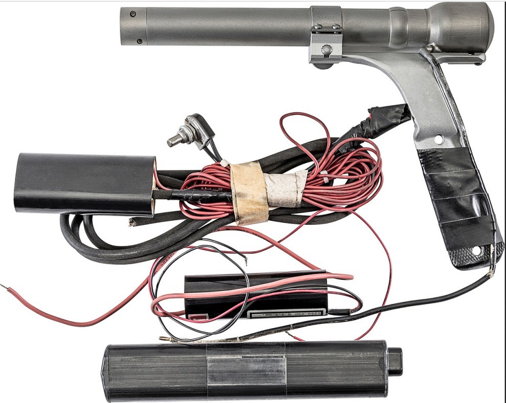 Ο εφευρέτης θυμάται ότι η παραγωγή του έφερε το ασυνήθιστο πιστόλι και στο εργαστήριο του κατασκεύασε μια χειροποίητη βάση που προσαρμοζόταν στη λαβή του.
