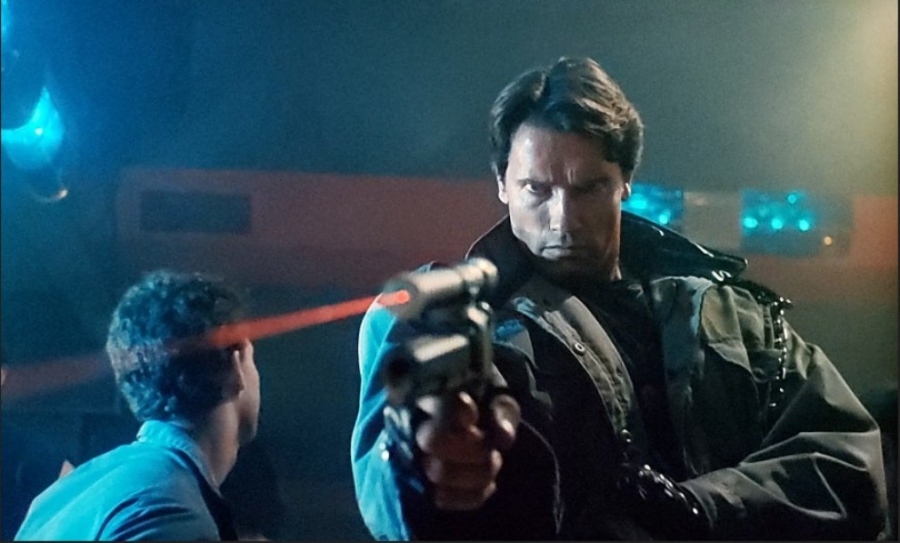 Ο ρομποτικός εκτελεστής με τη μορφή του Άρνολντ Σβαρτζενέγκερ ζητά από τον πωλητή πίσω από τον πάγκο του (φανταστικού) οπλοπωλείου “Alamo Sport Shop” να του δείξει το παράξενο και μοναδικό πιστόλι.