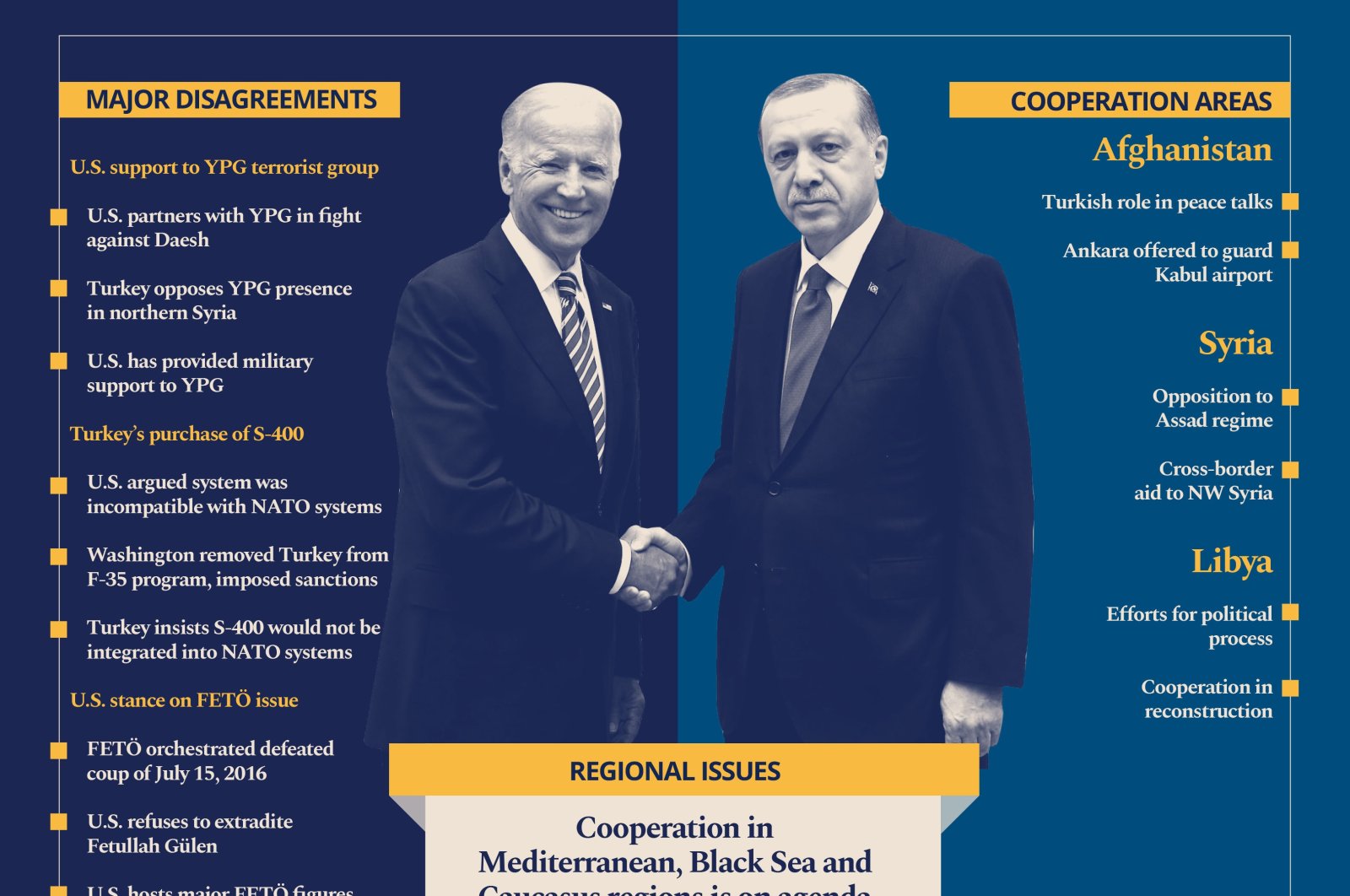 Οι δύο ηγέτες αναμένεται να διαχωρίσουν τις διαφωνίες τους - όπως S 400, Ανατολική Μεσόγειος και οργανώσεις τύπου FETΟ (Gullen) και YPG - και να επικεντρωθούν σε βασικούς τομείς συνεργασίας, ιδίως στο Αφγανιστάν, τη Συρία, την Ουκρανία και τη Λιβύη.