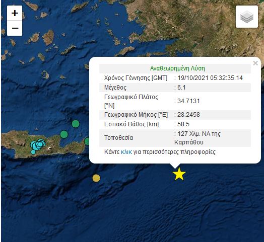 (upd3) Ένας ακόμα ισχυρότατος σεισμός μεγέθους 6,1 Ρίχτερ καταγράφηκε σήμερα Τρίτη 19/10 στον θαλάσσιο χώρο ανοιχτά της Καρπάθου, με τους σεισμολόγους πάντως να εμφανίζονται ιδιαίτερα καθησυχαστικοί, επισημαίνοντας πως ο σεισμός αυτός δεν συνδέεται με αυτούς στην Κρήτη ή στην Τήλο.