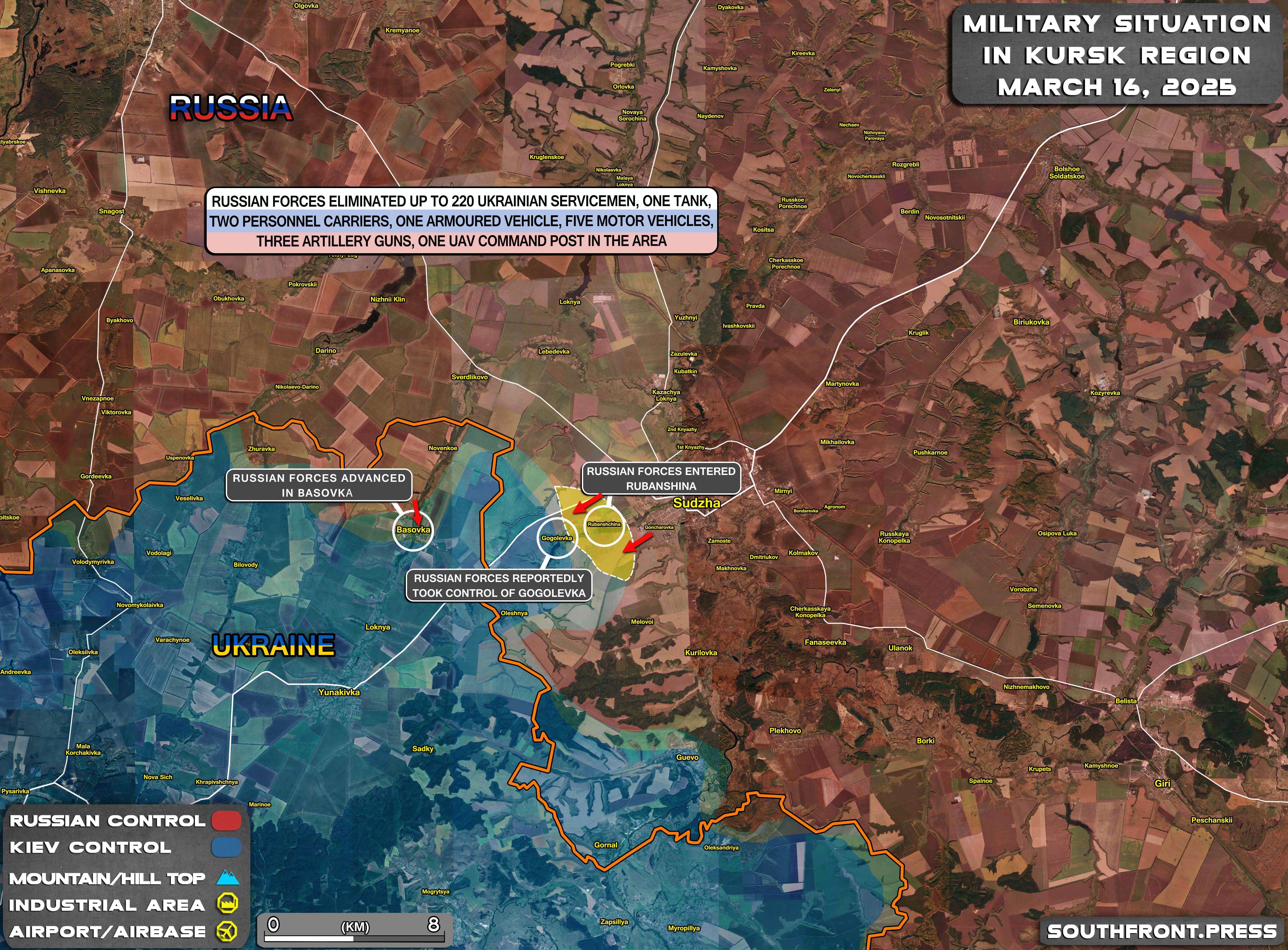 Πληροφορίες αναφέρουν πως πολλοί Ουκρανοί προσπάθησαν να εγκαταλείψουν τη ζώνη μάχης και να υποχωρήσουν μέσω του αυτοκινητοδρόμου Sudzha - Yunakovka προς την ουκρανική περιοχή Sumy.