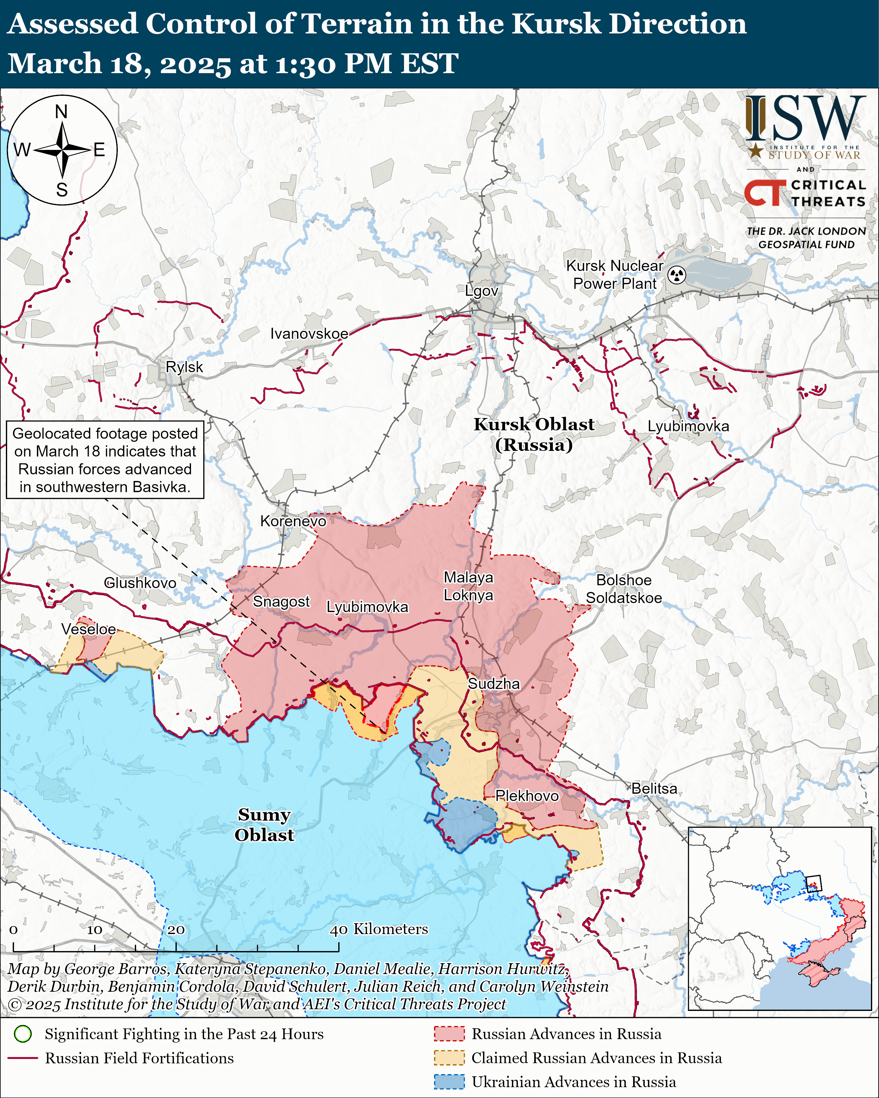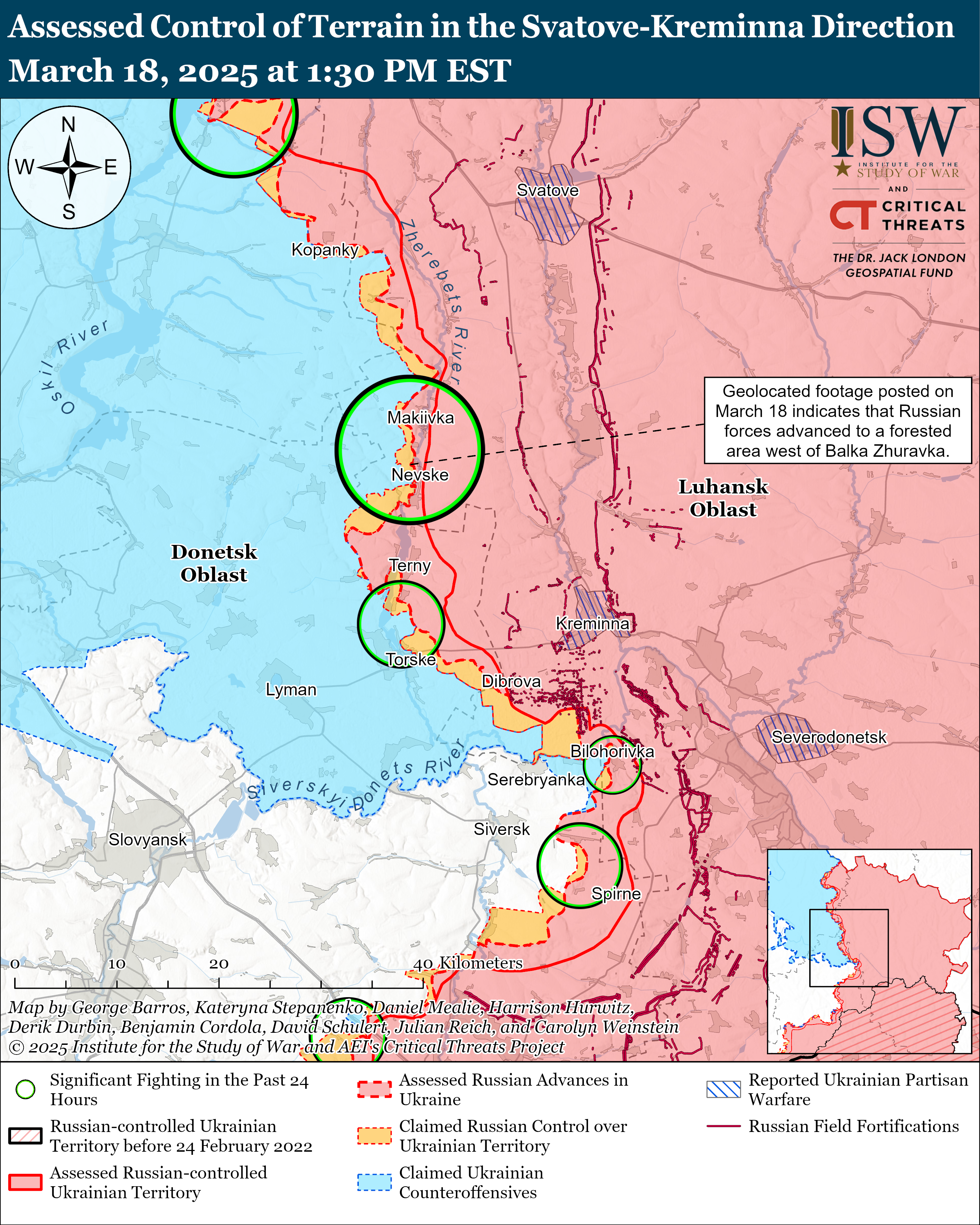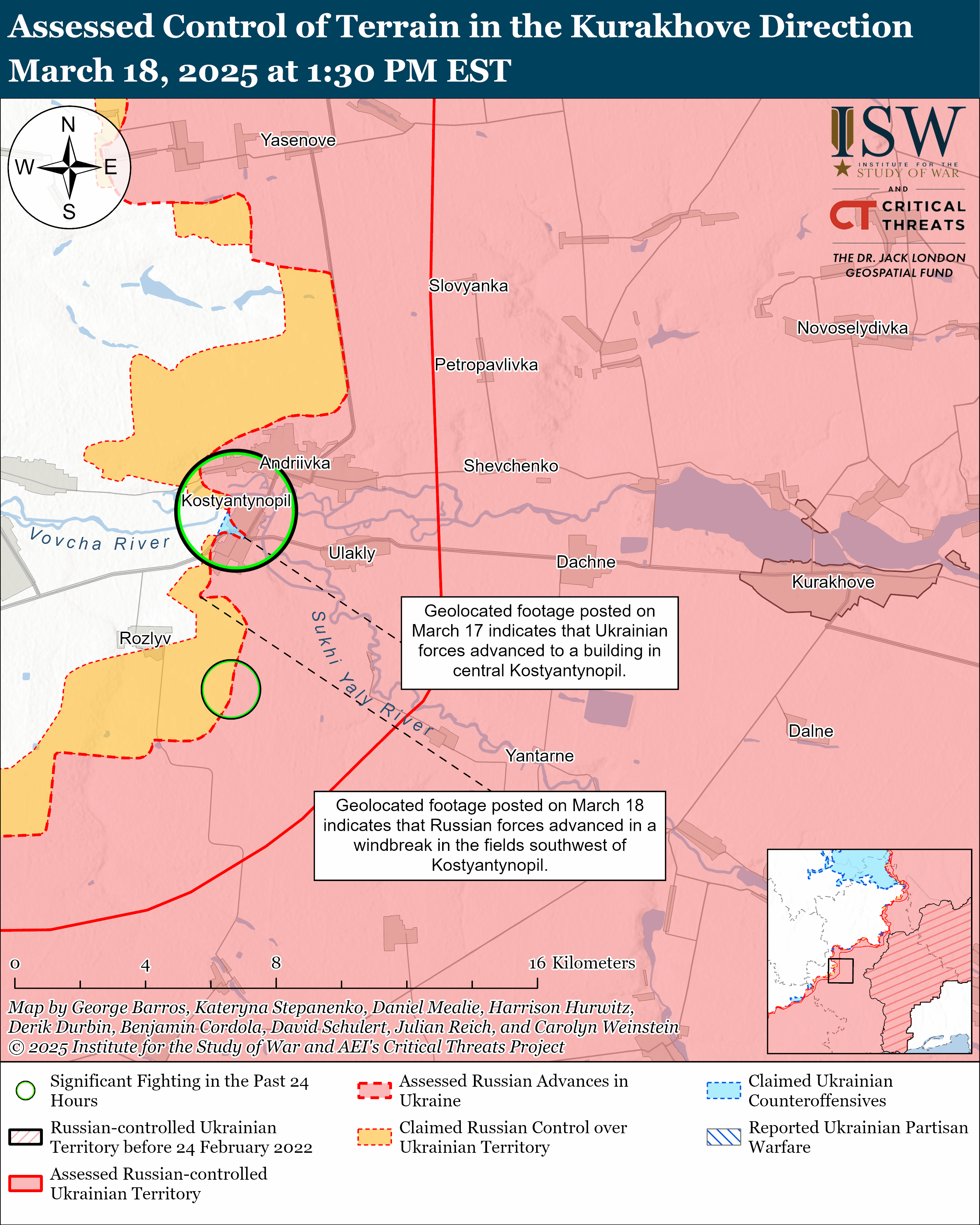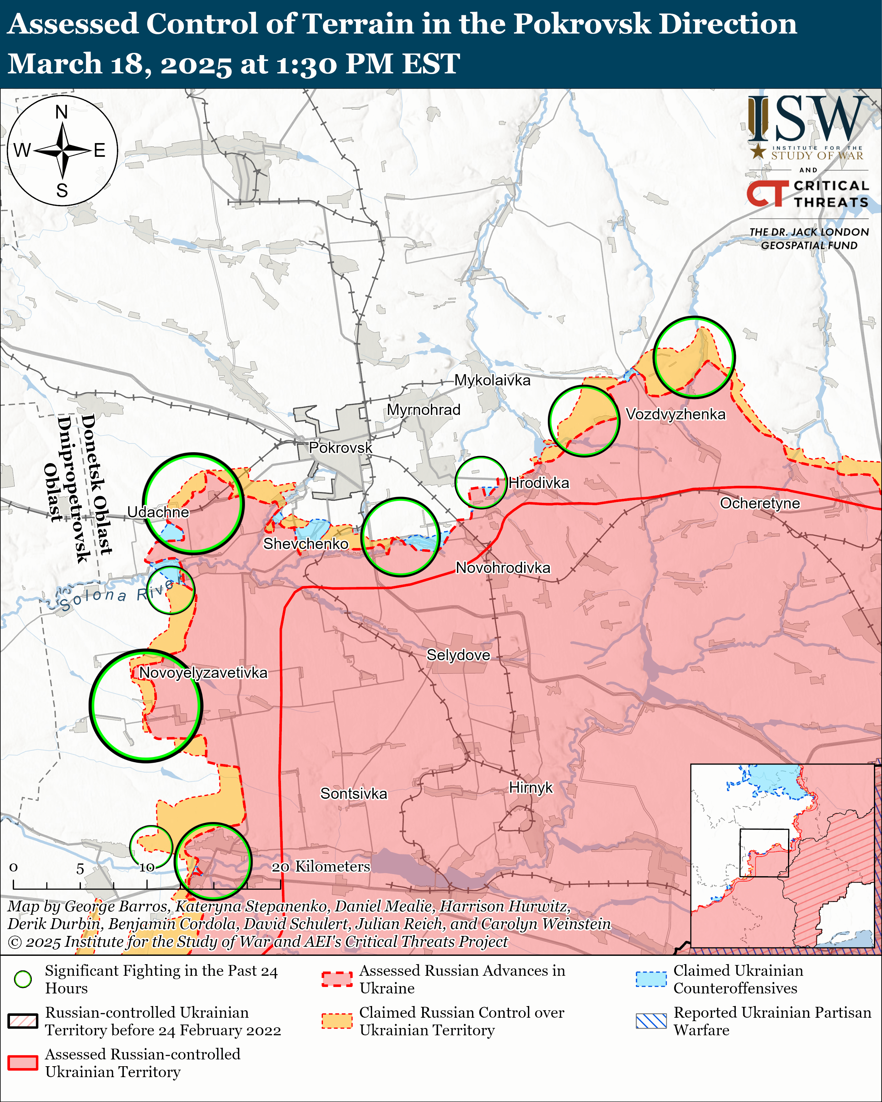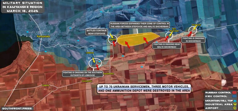 Το γεωγραφικό υλικό που δημοσιεύτηκε στις 18 Μαρτίου δείχνει ότι οι ρωσικές δυνάμεις προχώρησαν πρόσφατα ανατολικά του Kamyanske).