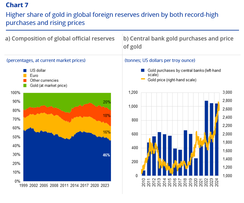 Νέα στοιχεία που δημοσιεύθηκαν αυτή την εβδομάδα από την ΕΚΤ έδειξαν ότι ο χρυσός ξεπέρασε το ευρώ πέρυσι για να γίνει το δεύτερο μεγαλύτερο αποθεματικό περιουσιακό στοιχείο στον κόσμο μεταξύ των παγκόσμιων κεντρικών τραπεζών, μετά από ένα ρεκόρ αγορών.