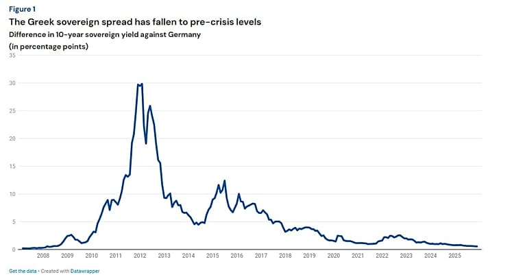 Τον Μάιο του 2025, το spread του ελληνικού 10ετούς κρατικού ομολόγου έναντι του γερμανικού Bund υποχώρησε κάτω από τις 80 μονάδες βάσης για πρώτη φορά από το 2007. Τα επίπεδα αυτά παραπέμπουν στην προ κρίσης περίοδο, όταν τα κρατικά ομόλογα της ευρωζώνης θεωρούνταν από τις αγορές σχεδόν ισοδύναμα.
