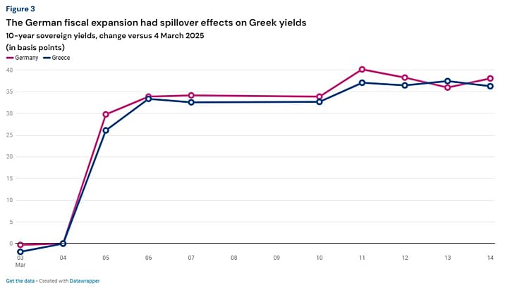 Για παράδειγμα, μια σημαντική δημοσιονομική επέκταση που ανακοινώθηκε στη Γερμανία τον Μάρτιο του 2025 οδήγησε σε αύξηση περίπου 35 μονάδων βάσης στην απόδοση του γερμανικού 10ετούς ομολόγου, με τις ελληνικές αποδόσεις να ακολουθούν σχεδόν την ίδια πορεία.