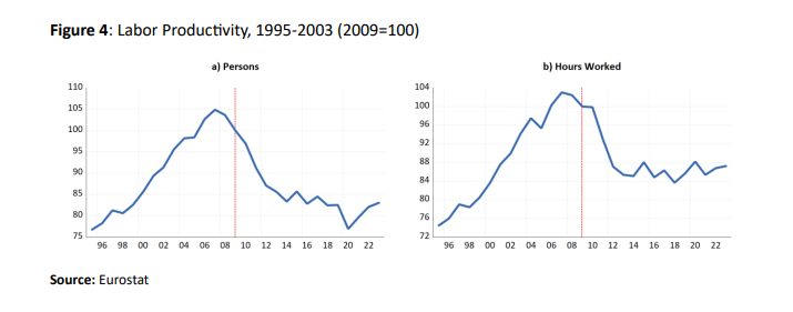 Το 2024, η παραγωγικότητα της εργασίας στην Ελλάδα ήταν 16% χαμηλότερη από τα επίπεδα του 2009 —χαμηλότερη σε σύγκριση με το επίπεδο κατά το βάθος της κρίσης το 2015.