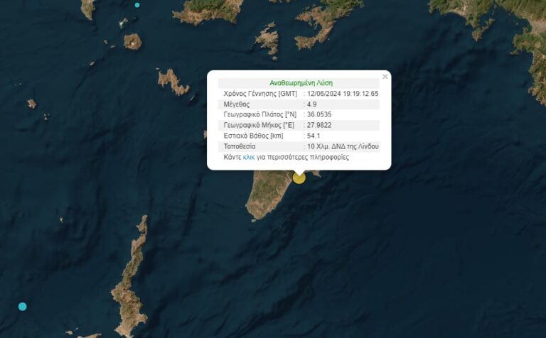 Σε θέση 18 χιλιόμετρα νότια της Λίνδου το επίκεντρο και το εστιακό βάθος στα 37,7 χιλιόμετρα