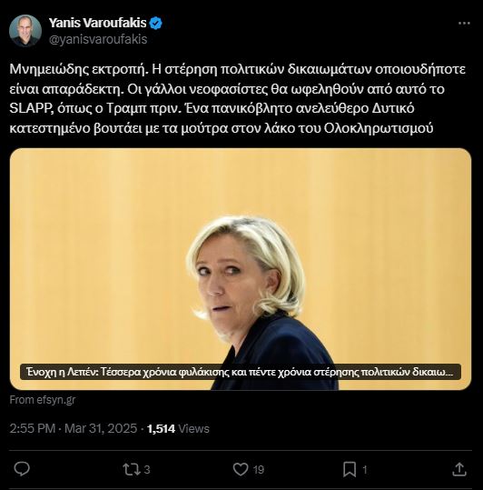 «Μνημειώδης εκτροπή. Η στέρηση πολιτικών δικαιωμάτων οποιουδήποτε είναι απαράδεκτη. Οι γάλλοι νεοφασίστες θα ωφεληθούν από αυτό το SLAPP, όπως ο Τραμπ πριν. Ένα πανικόβλητο ανελεύθερο Δυτικό κατεστημένο βουτάει με τα μούτρα στον λάκο του Ολοκληρωτισμού» αναφέρει ο πρώην υπουργός Οικονομικών και νυν γραμματέας του ΜέΡΑ 25 σε ανάρτηση του στα social media.