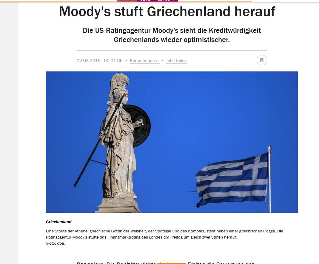 Θετικά για το μέλλον της Ελλάδας αξιολογεί την αναβάθμιση της Ελλάδας από τον αμερικανικό οίκο Moody’s η γερμανική οικονομική εφημερίδα Handelsblatt.