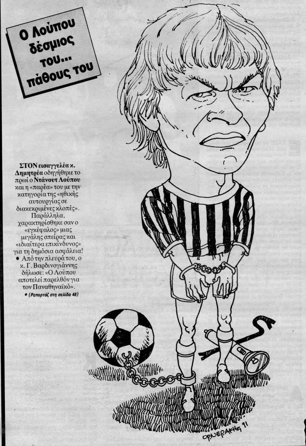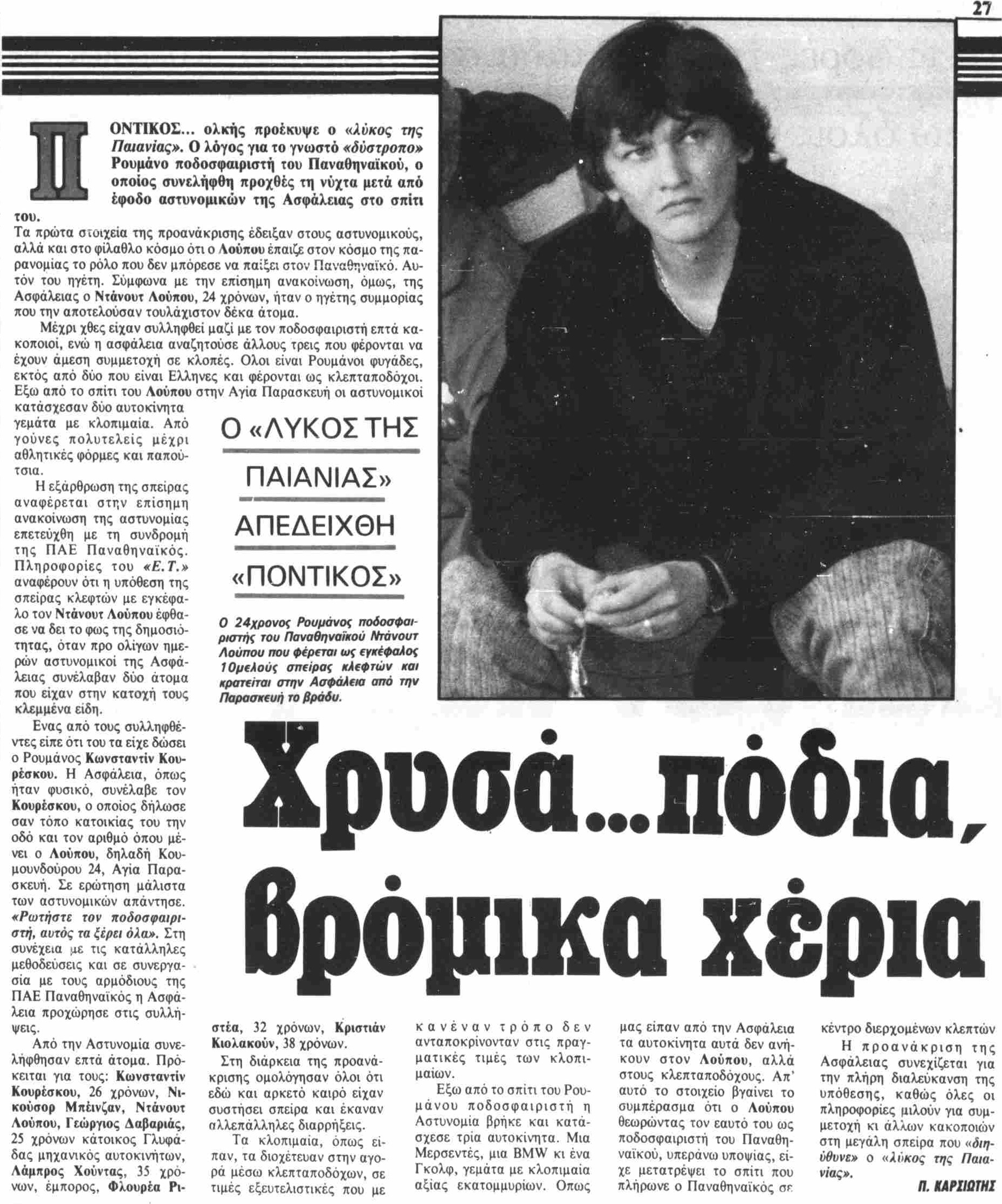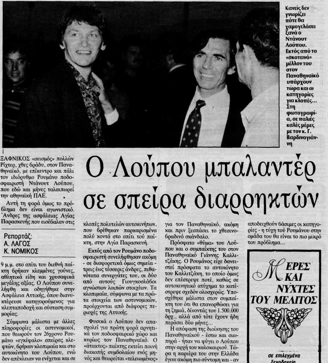 Η σύλληψη του Ρουμάνου διεθνή άσου του Παναθηναϊκού, Ντάνουτ Λούπου για κακούργημα, που περιλάμβαναν διακεκριμένες κλοπές διάφορων αντικειμένων, μικρής ή μεγάλης αξίας, από γούνες και ρετρό κοσμήματα, μέχρι ηλεκτρονικούς υπολογιστές και αθλητικές φόρμες, ήταν το θέμα συζήτησης για αρκετές ημέρες το 1991, απασχολώντας την ειδησεογραφία της εποχής. Ας πάρουμε όμως τα πράγματα από την αρχή.