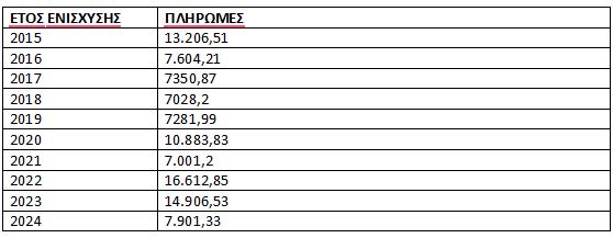 Οι πληρωμές του είναι κοντά στα 7.500 ευρώ κάθε χρόνο με εξαίρεση τα έτη που εντάχθηκε στο καθεστώς των βιολογικών οπότε και αυξάνεται η ενίσχυση όπως φαίνεται στον παρακάτω πίνακα.