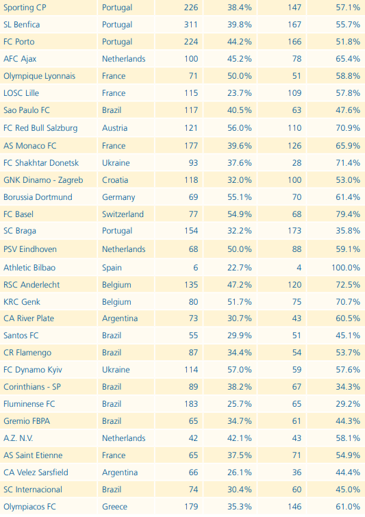 Μια διαφορετική φιλοσοφία παρατηρείται την τελευταία δεκαετία στον Ολυμπιακό. Οι «ερυθρόλευκοι» βρίσκονται στην 30η θέση της λίστας με τις ομάδες που έχουν σημειώσει τα μεγαλύτερα κέρδη από μεταγραφές παγκοσμίως, ενώ σε ευρωπαϊκό πλαίσιο κατέχουν την 21η! Στο top 3 βρίσκεται ο συνδυασμός των Σπόρτινγκ Λισαβόνας, Μπενφίκα και Πόρτο οι οποίες έχουν βγει ιδιαιτέρως κερδισμένες από τα deals.