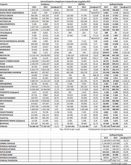 Σε σύνολο 48 εταιρειών που έχουν δημοσιεύσει, ο τζίρος εμφανίζεται μειωμένος κατά 11% και στα 69,1 δισ. ευρώ (λόγω του ενεργειακού το 2022), αλλά τα κέρδη προ φόρων, τόκων και αποσβέσεων (EBITDA) εμφανίζουν αύξηση 3,6% και ανέρχονται στα 11,6 δισ. ευρώ από 11,2 δισ. ευρώ.