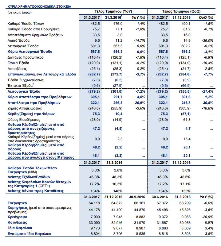 Επίσης, τα Κύρια Αποτελέσματα προ Προβλέψεων ενισχύθηκαν κατά 4,6% σε ετήσια βάση ή 1,2% σε τριμηνιαία βάση και ανήλθαν κατά το α΄ τρίμηνο 2017 σε Ευρώ 305,1 εκατ.